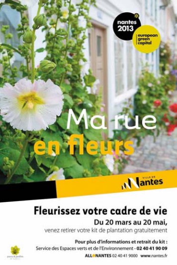 Au printemps 2011, un fleurissement de rue réalisé par les habitants, avait été expérimenté à Nantes Est dans le cadre du conseil de quartier de Doulon-Bottière. Cette initiative est reconduite mais cette fois-ci à l’échelle de la ville avec des kits composés de graines de variétés florales locales et qui s’adaptent à l’environnement urbain. Persistantes et peu gourmandes en eau, elles ont été choisies par Philippe Férard, botaniste au Jardin des plantes et spécialiste de la flore locale. Les roses trémières, valérianes des murs, campanules, capucines ou bouillons blancs, une fois semés, pourront coloniser pacifiquement les pieds d’arbres et les bordures de trottoirs. « L’objectif est d’essaimer de la biodiversité et de la nature dans la ville et ses quartiers », précise Marie-France Ringeard, du Service des espaces verts et de l’environnement de la Ville (Seve).